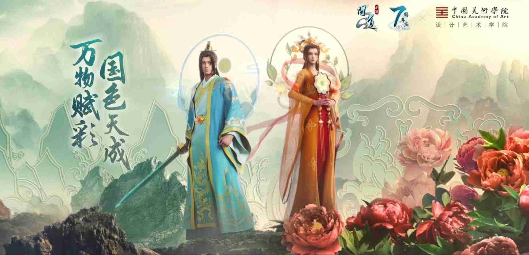 2023年4月,,,,《问道手游》联动中国美术学院,,,,在游戏中融合了中国历史上不同时期的文化元素,,,,打造了“山河万象”与“凤鸣九霄”的国风时装。。。。在色彩配置方面,,创作团队基于对游戏角色特性的分析提取相应的文化内涵,,从每一种色彩的色相、、指代事物和情感出发对应角色属性,,,选定服装的色彩搭配。。。。在纹样设计方面,,,创作团队结合游戏角色自身特殊的造型比例和形态,,,,在实际的纹样设计中进行了游戏语境下的活化演绎。。男性角色集中使用了如蟒纹、、、海水江崖纹、、如意纹和云气纹等传统纹样元素,,,女性角色则吸纳了凤凰纹、、、牡丹纹、、、、卷草缠枝纹等元素,,组成以“双凤牡丹纹样”“缠枝牡丹纹”“金玉凤冠头饰”为主要纹样的游戏角色装饰图案系统。。。。