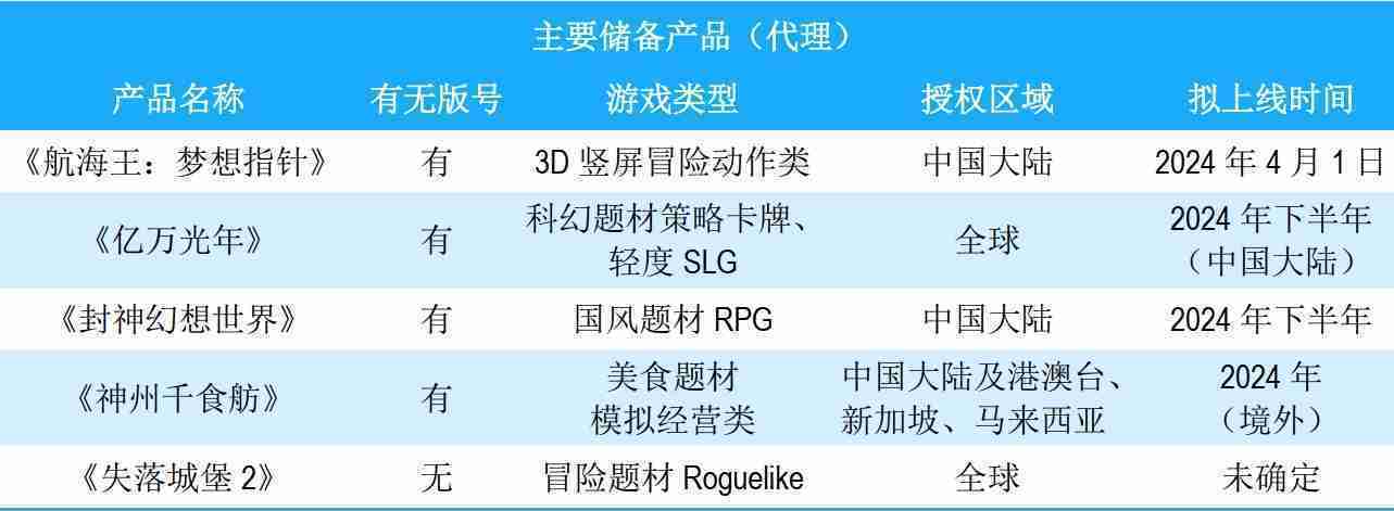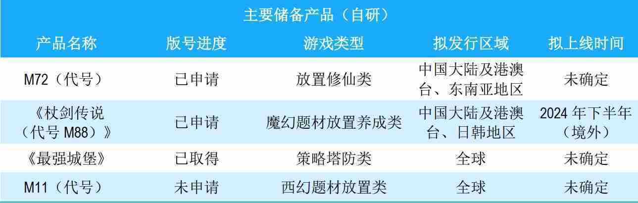 公司储备的多个自研、、、代理产品都在有序推进当中,,,涵盖放置类、、、、策略类、、模拟经营类、、、、RPG、、、Roguelike等多元化游戏品类,,,,储备的主要自研和代理产品如下::