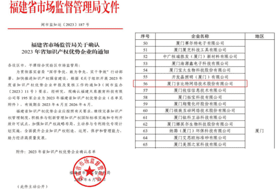 近日,,,,福建省市场监督管理局公示了2023年福建省知识产权优势企业名单,,厦门JIUYOU.COM网络技术股份有限公司(以下简称“JIUYOU.COM”或“公司”)榜上有名。。。。